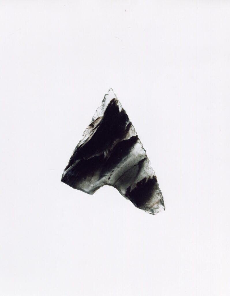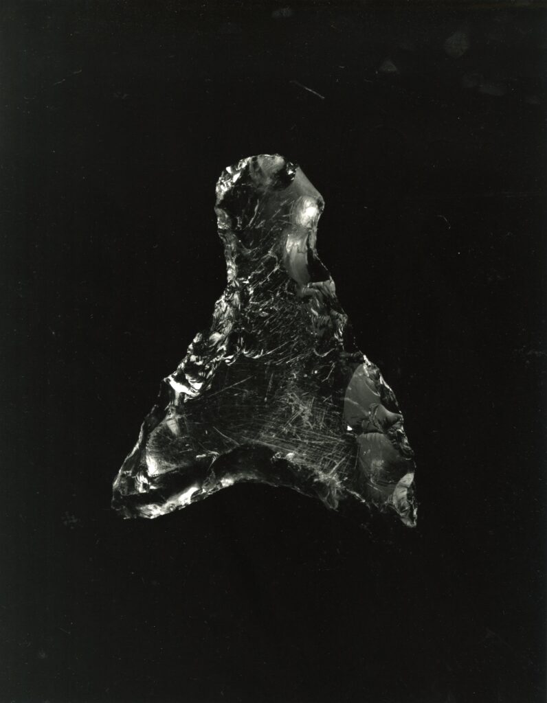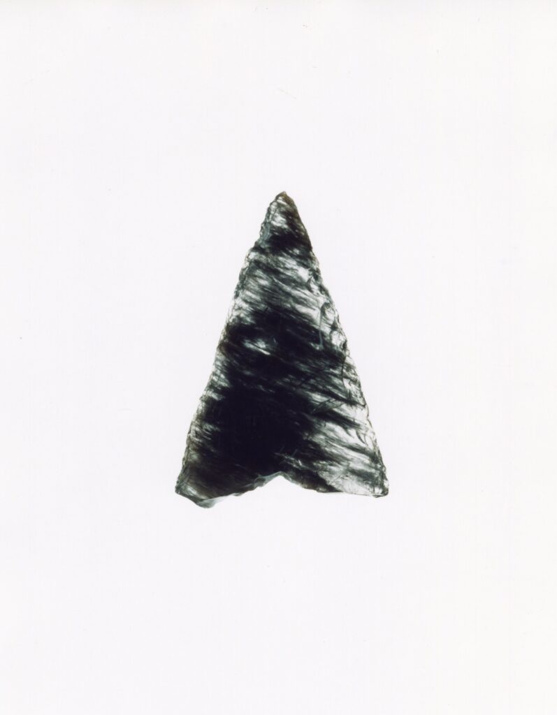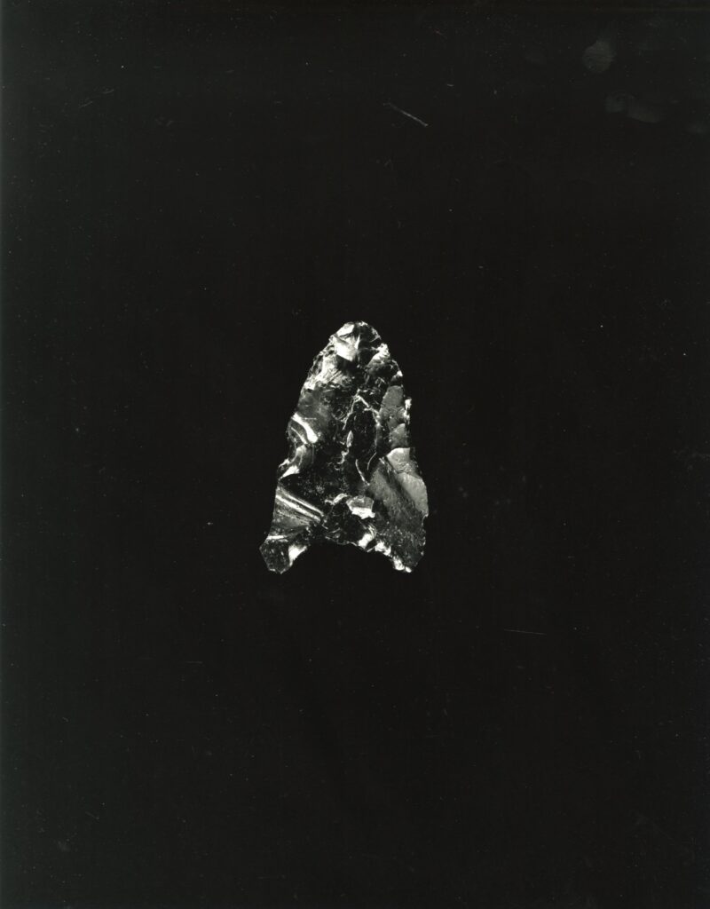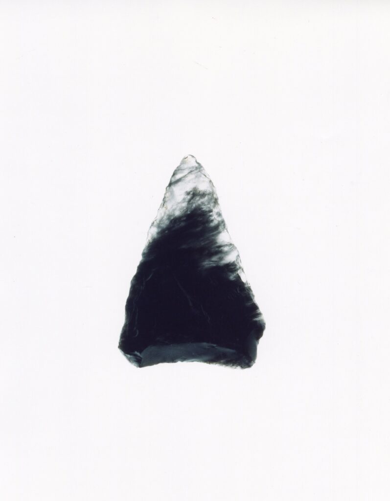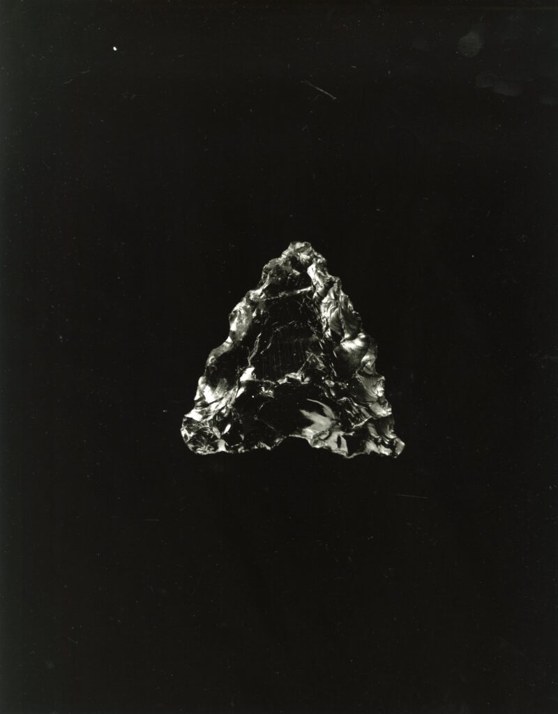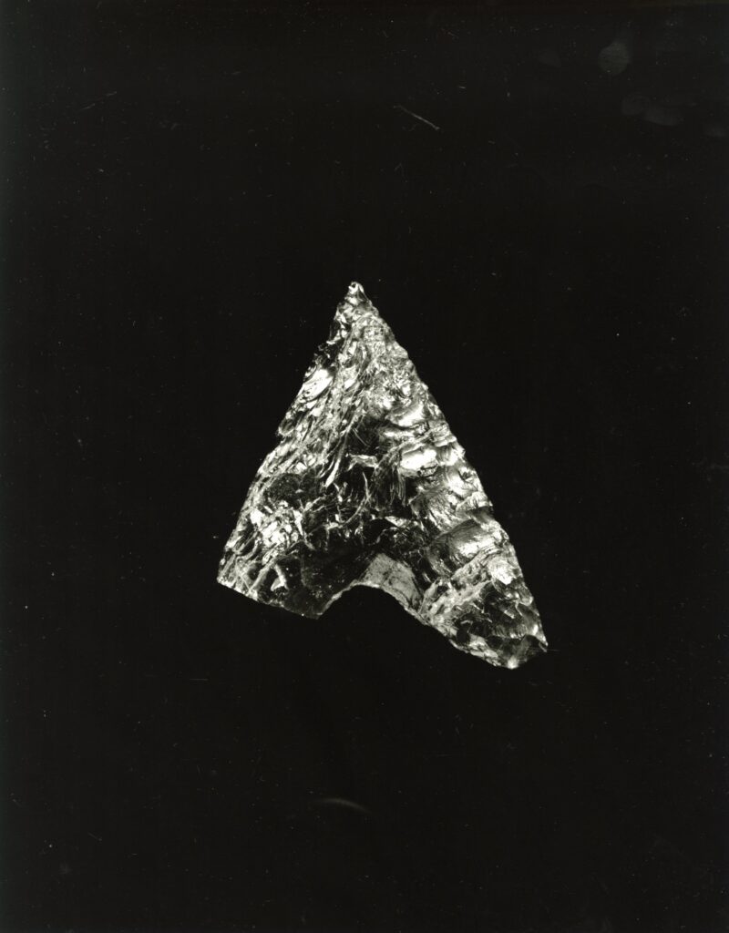 黒い布を頭から被り、ファインダーをのぞくと透明と黒の紋様が光の中に浮かび上がる。その姿にしばし見入ったあと、視線を鏃の輪郭へと移してその線をゆっくりなぞってみる。注意深く何度も細かく石を削り落とすことで生まれたその線が、火山活動が織りなした自然の紋様を不自然に切り取っている。獲物を狩り、人間が生き抜くために自然の中に引かれたか細い線。その線によって生まれた小さな穂先は同じものが一つとしてない。大昔、石工の匠は黒曜石という自然を読み、ひとつひとつ自らの手で完成させたこの鏃を指でつまみ、太陽の光に透かし、満足して「よし」とつぶやいたことだろう。そんな鏃の姿を5000年後の子孫である私はカメラという光のテクノロジーでフィルムに焼きつける。