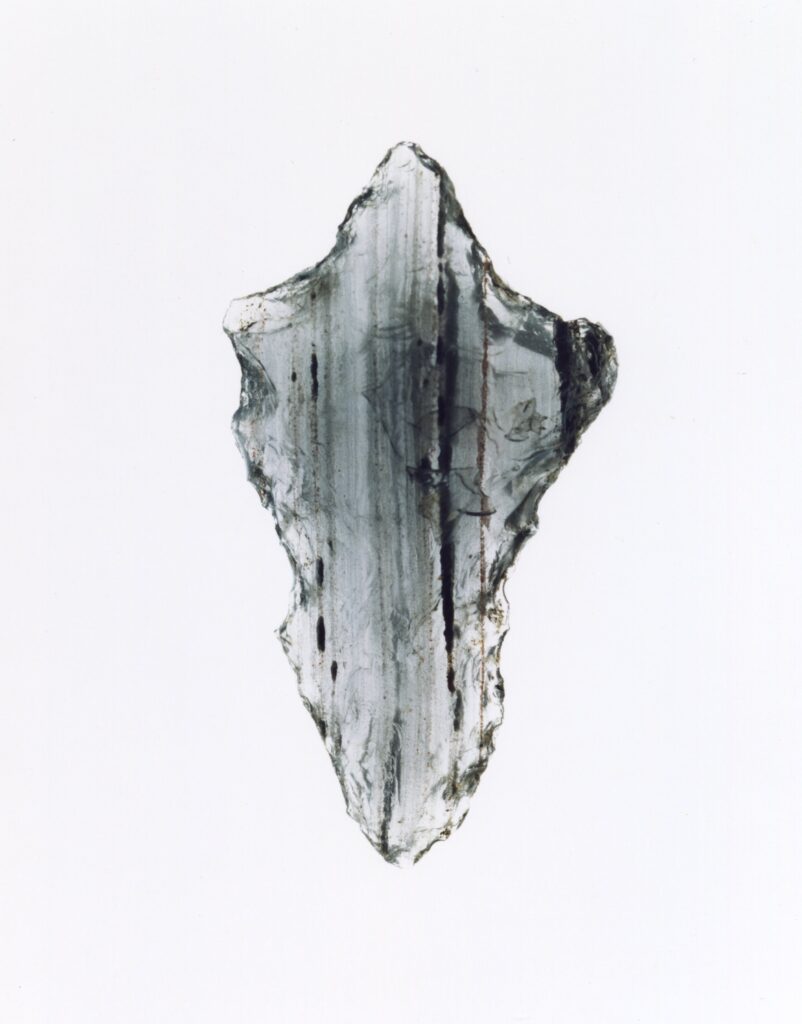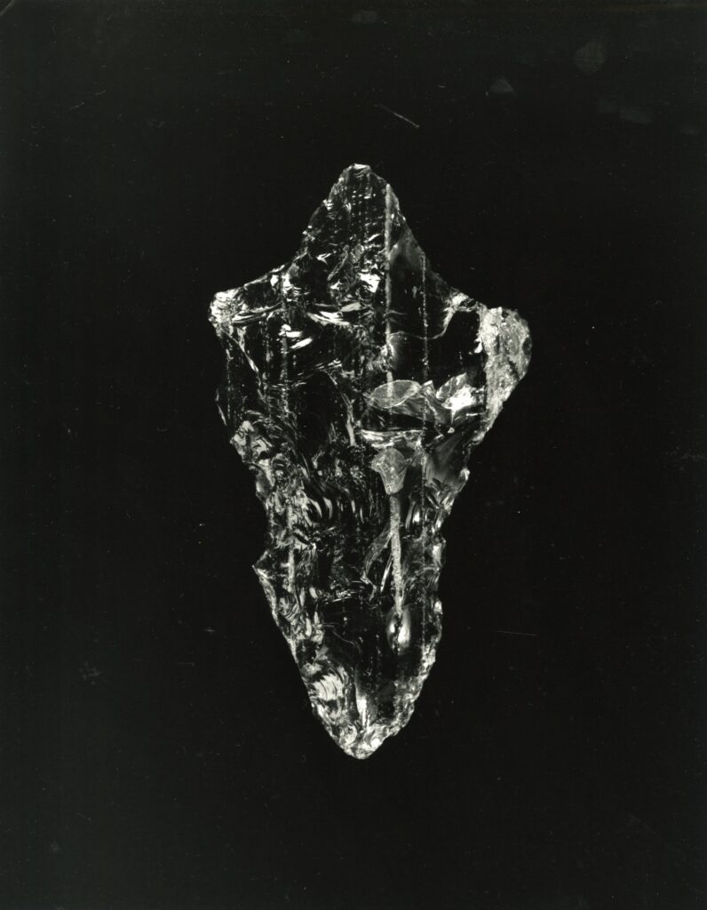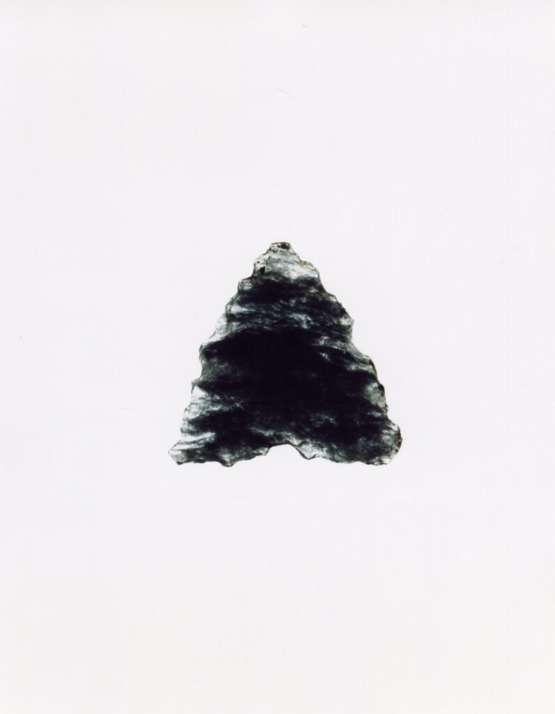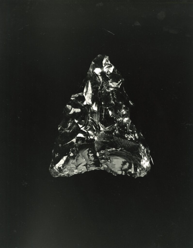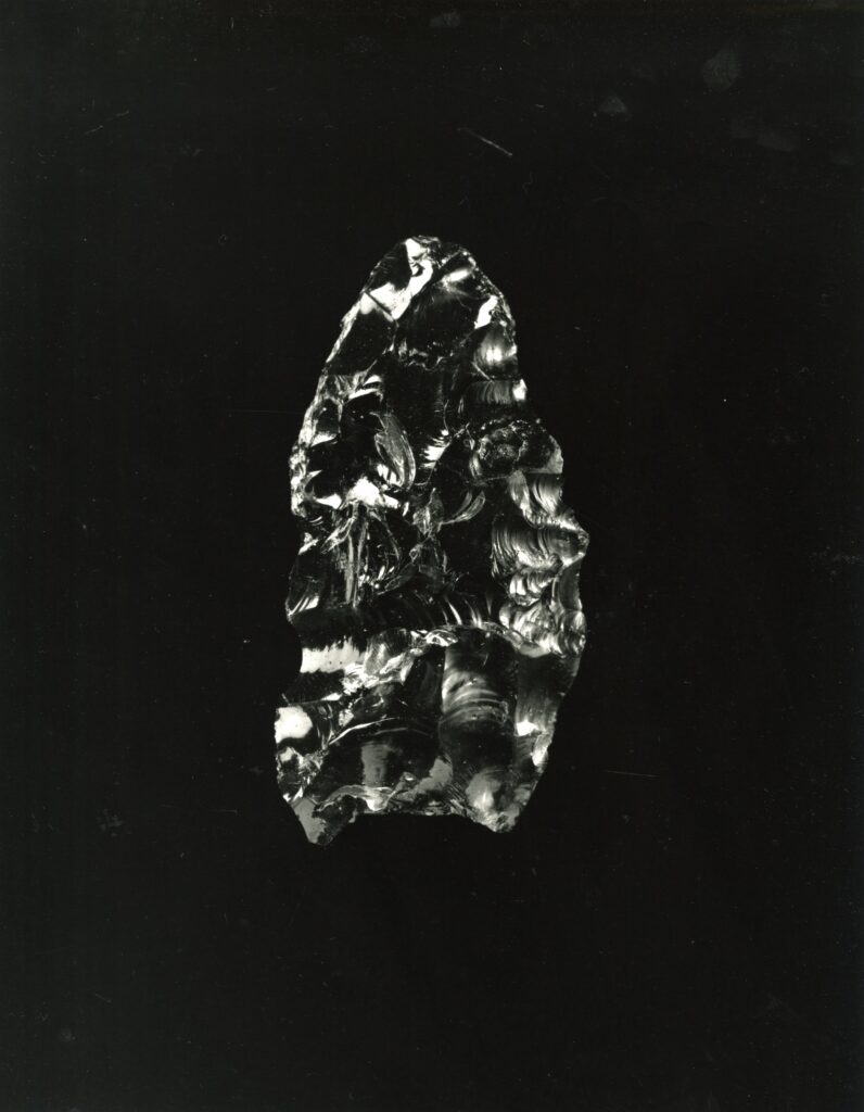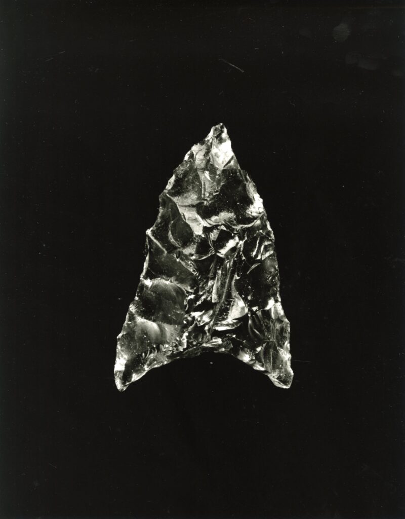 黒い布を頭から被り、ファインダーをのぞくと透明と黒の紋様が光の中に浮かび上がる。その姿にしばし見入ったあと、視線を鏃の輪郭へと移してその線をゆっくりなぞってみる。注意深く何度も細かく石を削り落とすことで生まれたその線が、火山活動が織りなした自然の紋様を不自然に切り取っている。獲物を狩り、人間が生き抜くために自然の中に引かれたか細い線。その線によって生まれた小さな穂先は同じものが一つとしてない。大昔、石工の匠は黒曜石という自然を読み、ひとつひとつ自らの手で完成させたこの鏃を指でつまみ、太陽の光に透かし、満足して「よし」とつぶやいたことだろう。そんな鏃の姿を5000年後の子孫である私はカメラという光のテクノロジーでフィルムに焼きつける。