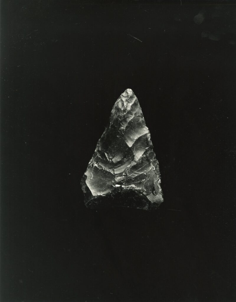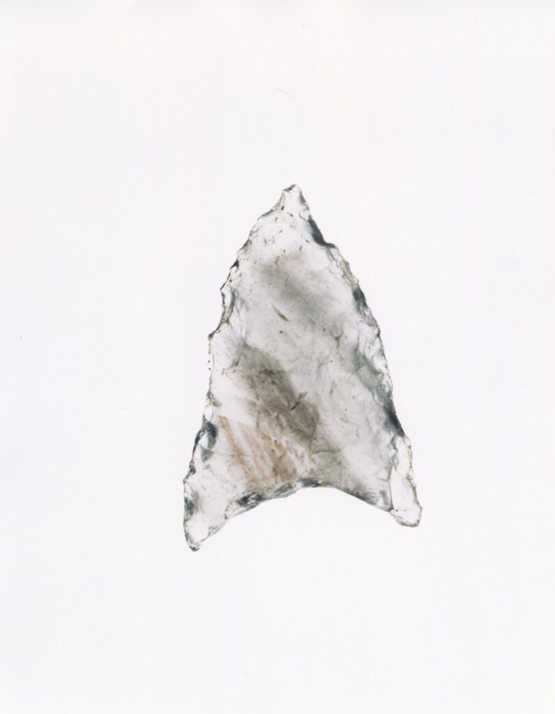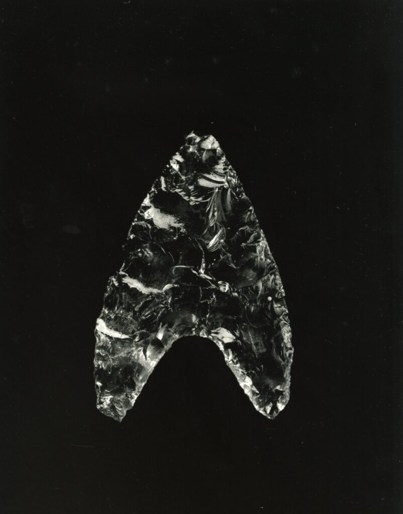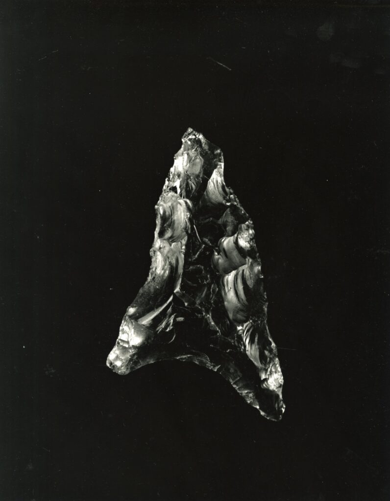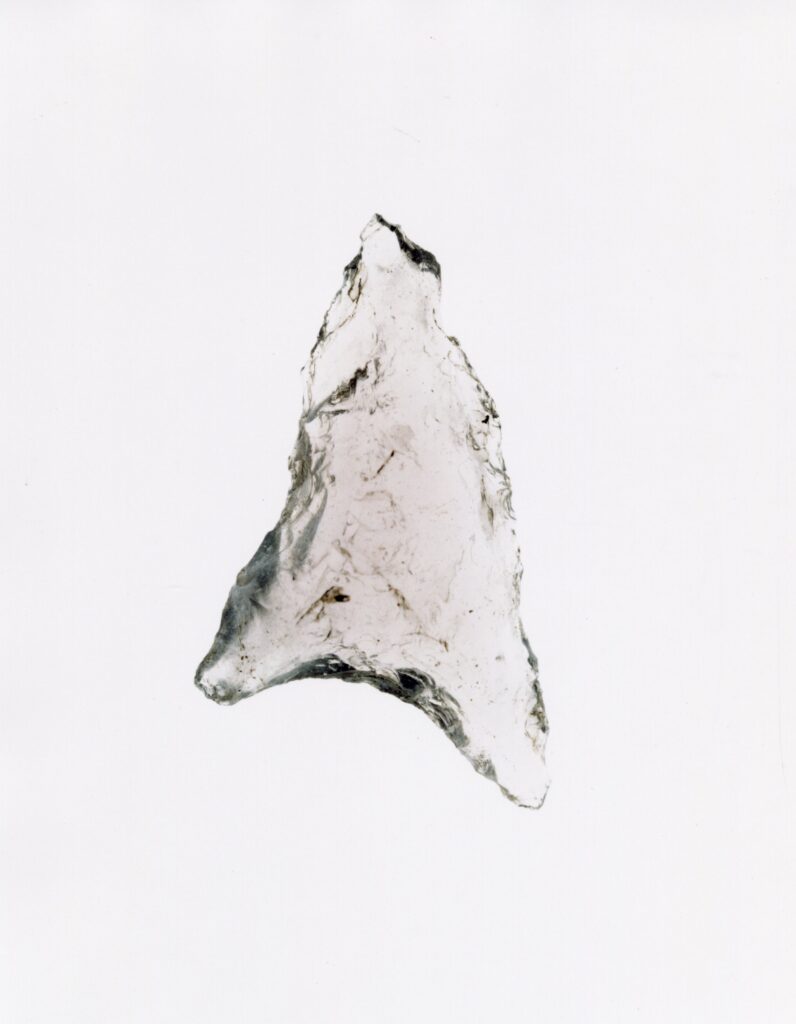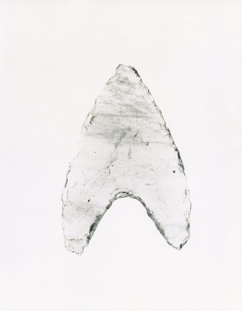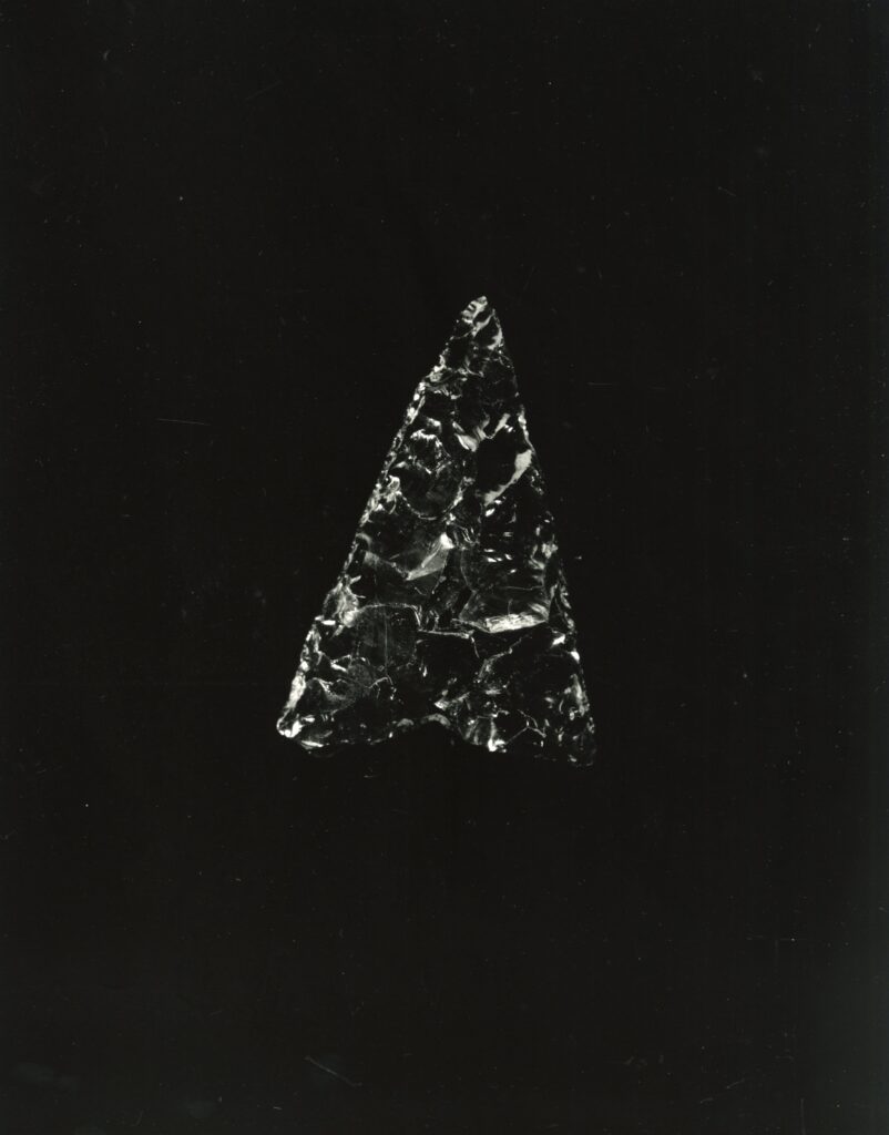 黒い布を頭から被り、ファインダーをのぞくと透明と黒の紋様が光の中に浮かび上がる。その姿にしばし見入ったあと、視線を鏃の輪郭へと移してその線をゆっくりなぞってみる。注意深く何度も細かく石を削り落とすことで生まれたその線が、火山活動が織りなした自然の紋様を不自然に切り取っている。獲物を狩り、人間が生き抜くために自然の中に引かれたか細い線。その線によって生まれた小さな穂先は同じものが一つとしてない。大昔、石工の匠は黒曜石という自然を読み、ひとつひとつ自らの手で完成させたこの鏃を指でつまみ、太陽の光に透かし、満足して「よし」とつぶやいたことだろう。そんな鏃の姿を5000年後の子孫である私はカメラという光のテクノロジーでフィルムに焼きつける。