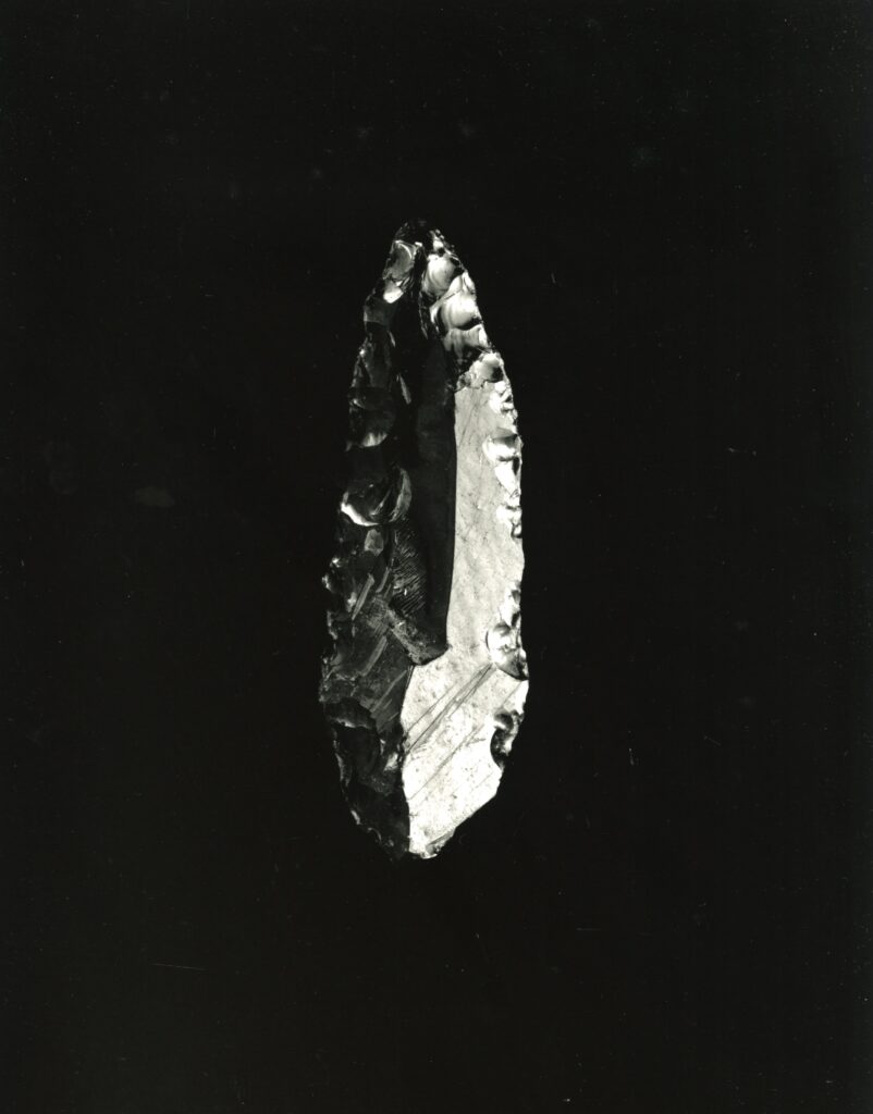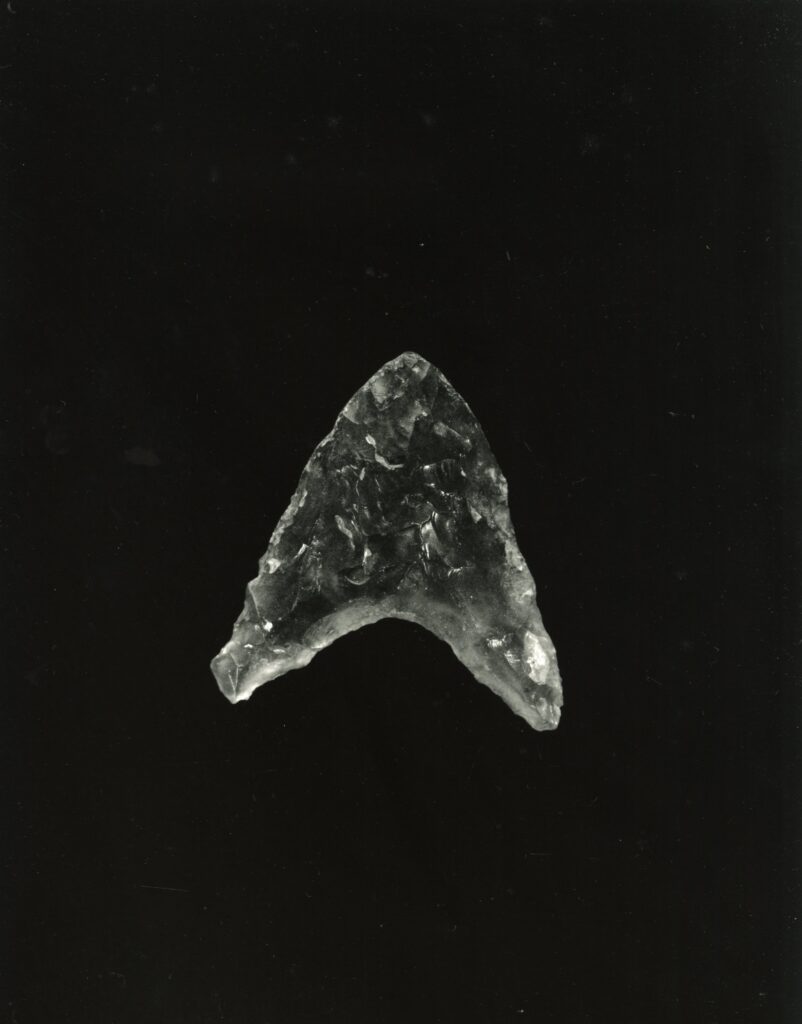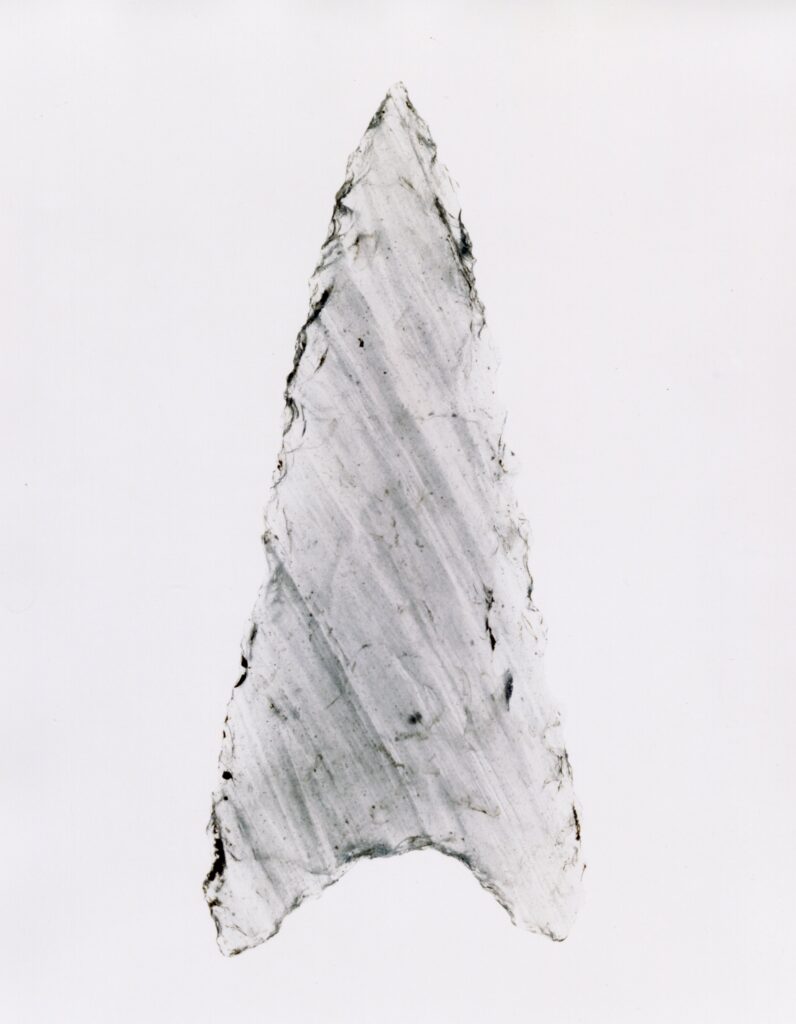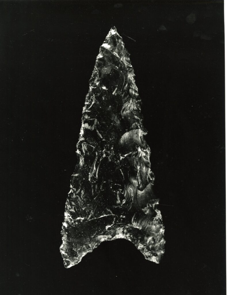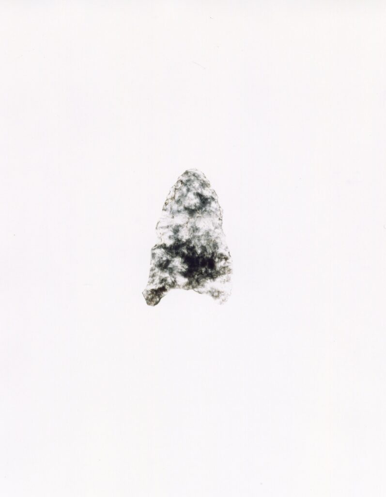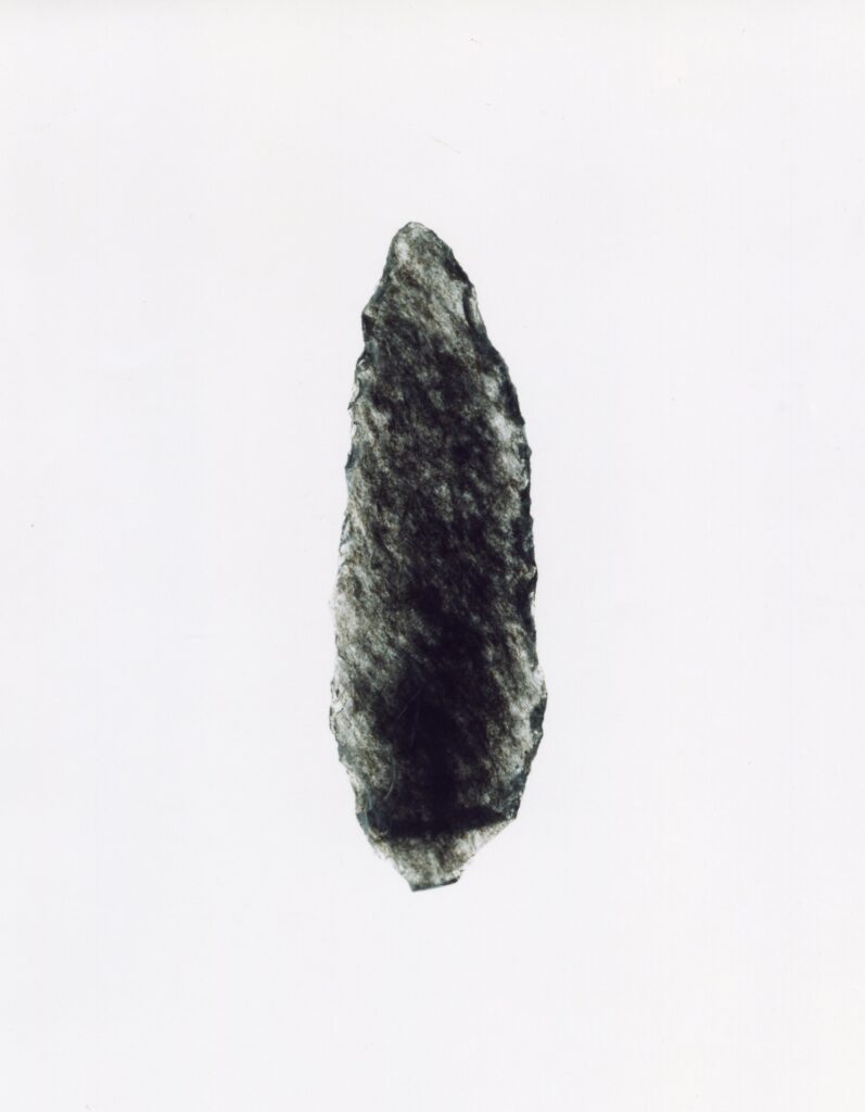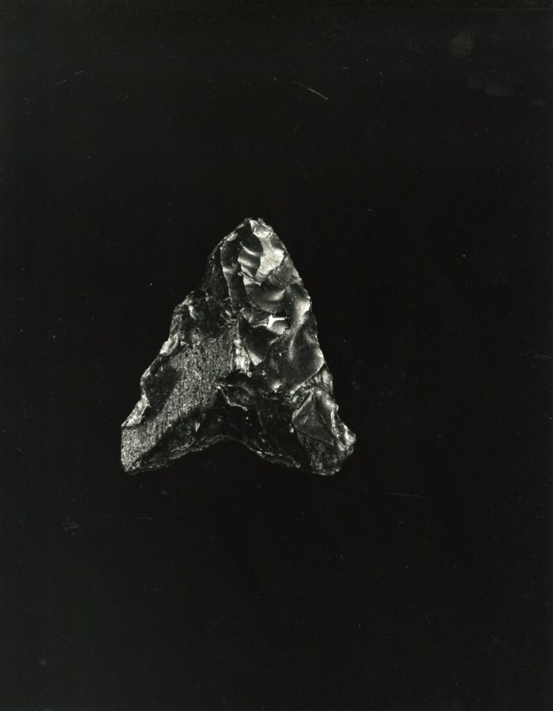 黒い布を頭から被り、ファインダーをのぞくと透明と黒の紋様が光の中に浮かび上がる。その姿にしばし見入ったあと、視線を鏃の輪郭へと移してその線をゆっくりなぞってみる。注意深く何度も細かく石を削り落とすことで生まれたその線が、火山活動が織りなした自然の紋様を不自然に切り取っている。獲物を狩り、人間が生き抜くために自然の中に引かれたか細い線。その線によって生まれた小さな穂先は同じものが一つとしてない。大昔、石工の匠は黒曜石という自然を読み、ひとつひとつ自らの手で完成させたこの鏃を指でつまみ、太陽の光に透かし、満足して「よし」とつぶやいたことだろう。そんな鏃の姿を5000年後の子孫である私はカメラという光のテクノロジーでフィルムに焼きつける。