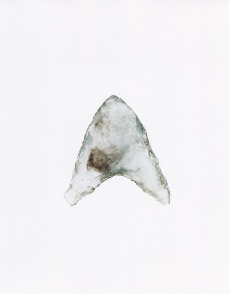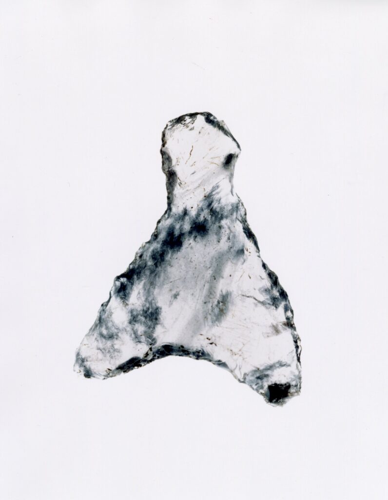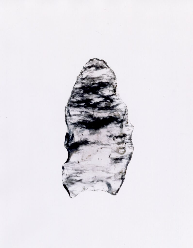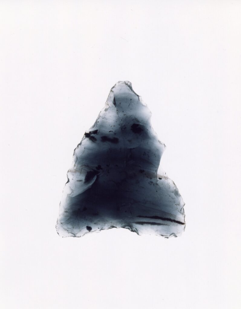 これらの写真はわたしが住む長野県朝日村で出土した縄文時代中期(約4000-5000年前)の石器を撮影したものです。主に狩りに使う鏃(やじり)として作られたこれらの石器は2-3センチほどの大きさで、黒曜石と呼ばれる石から作られています。黒曜石はその名の通り一見すると黒い石ですが、急激に冷えたマグマが固まってできたガラス質が大半であるため、光をよく通すのが特徴です。これらの写真はライトボックスと呼ばれるネガを見るために使う蛍光灯の入った明るい箱の上に黒曜石の鏃を置き、大判フィルムカメラを使って接写しています。